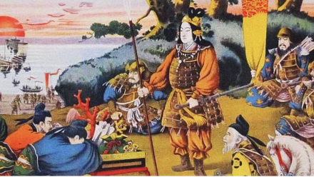 神宮皇后の三韓征伐の図。身重の体に、腹帯を巻いたと言われる。